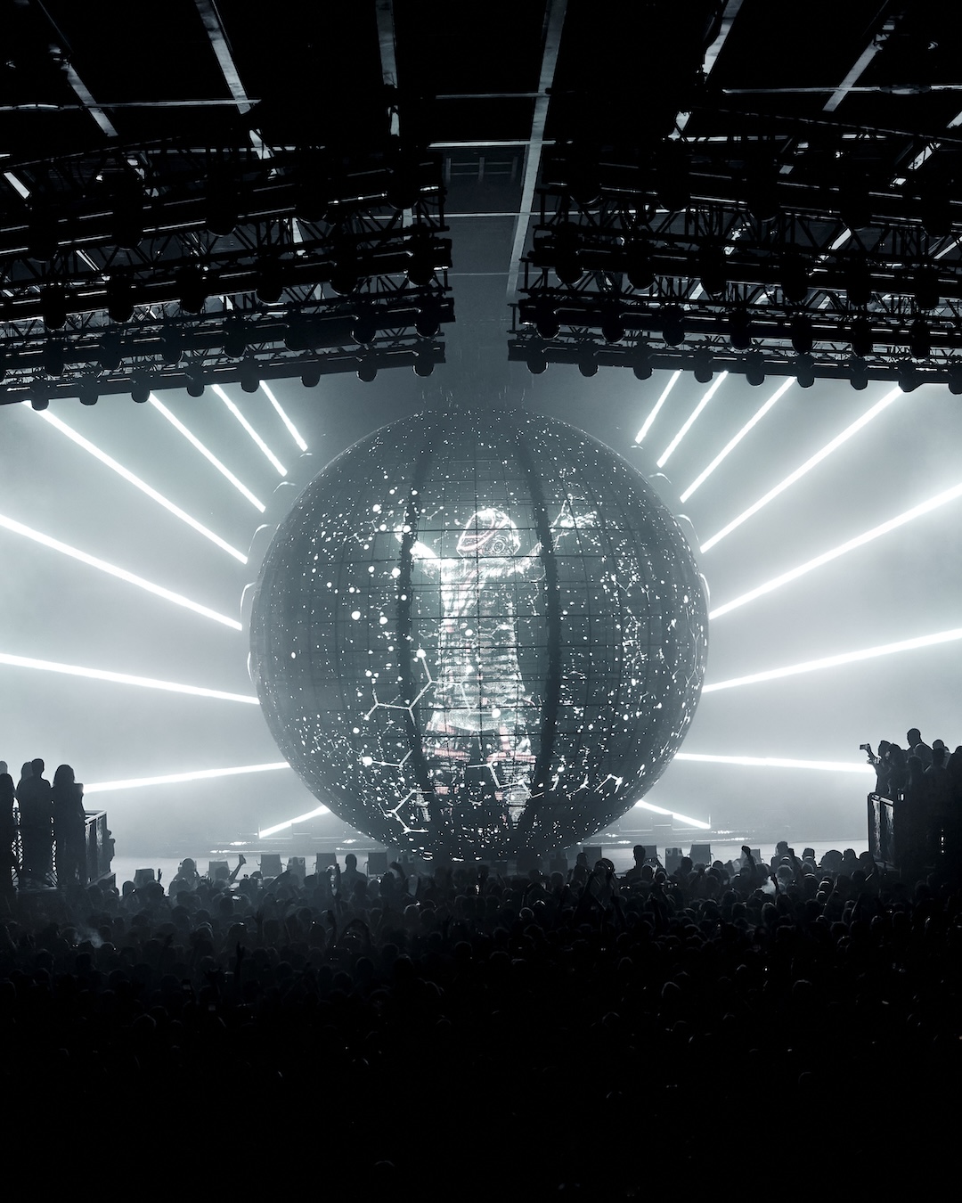 Constructing the Sphere required that every single component be custom-made, with no off-the-shelf parts utilized. Precision engineering was paramount, balancing the need for engineering-grade strength with near-total transparency. This ambitious undertaking was only feasible thanks to [UNVRS]’s expansive main room and arena-like infrastructure, making it one of the few venues globally capable of supporting such a structure.